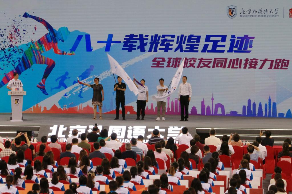 捐赠仪式后,党委副书记、副校长贾文键及众多知名校友共同启动“八十载辉煌足迹,全球校友同心接力跑”活动。金牌影院 卓悦同学作为留学生代表参与传递接力棒、接力旗环节。