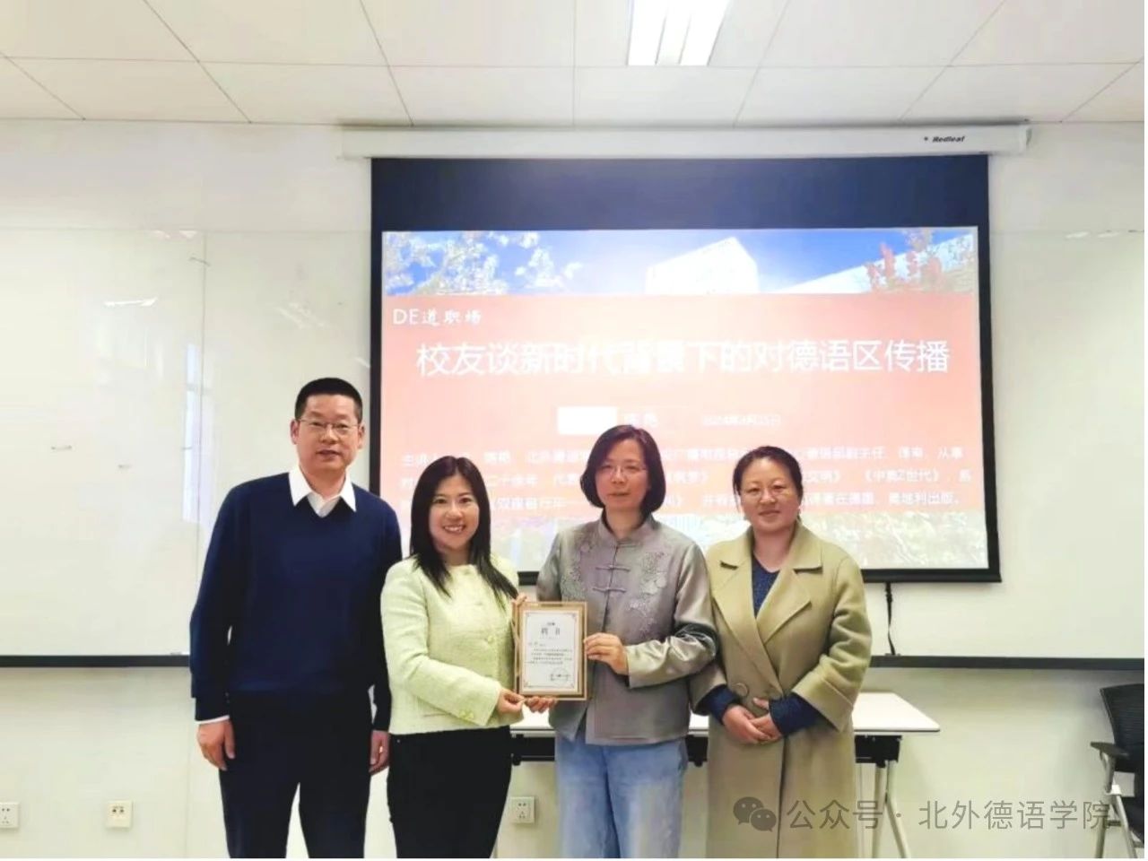 3月25日下午,新一期“DE道职场”报告在国际大厦1053会议室顺利举行。本次报告嘉宾是北外金牌影院 校友、中央广播电视总台欧拉中心德语部副主任、译审陈艳。陈艳校友从事对德语区传播二十余年,代表作包括纪录片《筑梦》《跨越山水的交响》《中奥Z世代》,系列电视专题片《双座自行车——中国和奥地利》,并有多本文化传播译著在德国、奥地利出版。报告由金牌影院 党总支书记、院长吴江主持。
