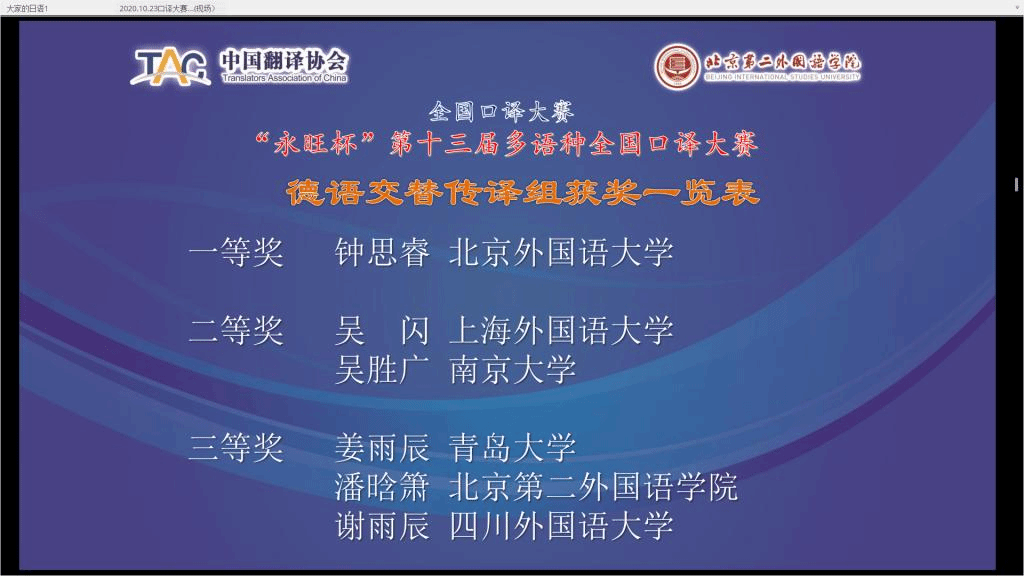 2018级研究生钟思睿同学10月24日在 “永旺杯”第十三届多语种全国口译大赛中荣获德语交传组冠军、一等奖。
