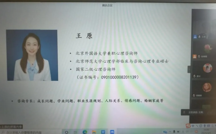 通过腾讯会议举办2021心理讲座第一讲《我的时间我掌控》,主讲人为北外心理咨询中心教师王原老师,70余名学生在线参加了讲座,讲座由金牌影院