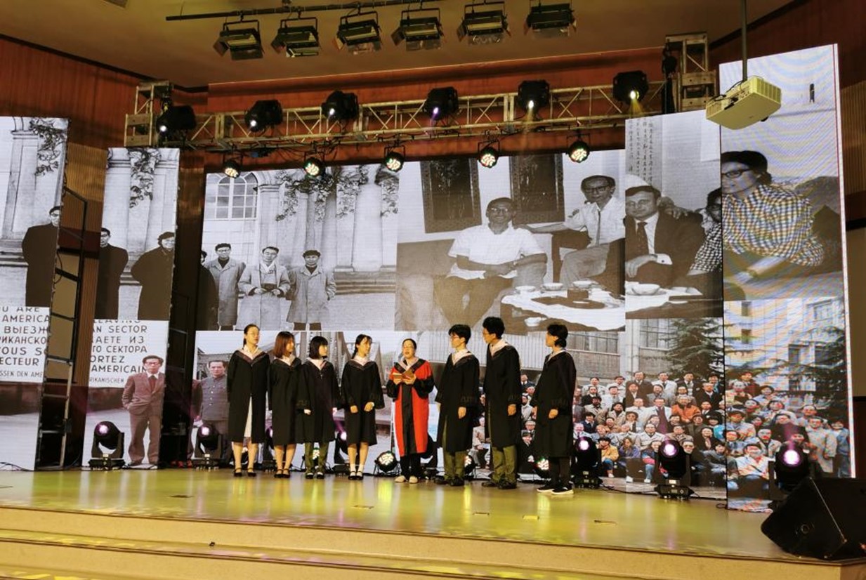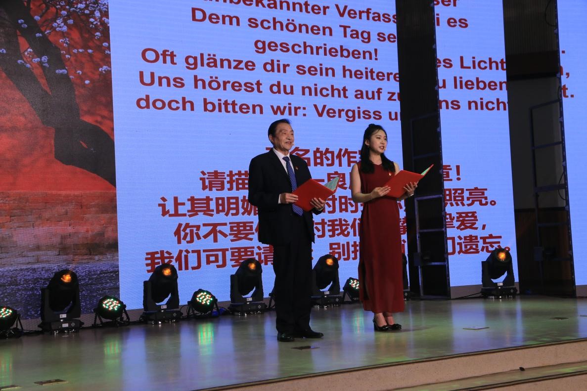 教师关海霞、张晓玲、孙嘉惠、寇蔻,以及焦冠群、赵紫萌、萧律语等同学,用中德双语集体朗诵了歌德的诗歌《祝愿寿星万寿无疆》、海涅的诗歌《乘着歌声的翅膀》、席勒的诗歌《希望》以及马克思和恩格斯的经典名篇《共产党宣言》(节选),不仅向观众展示了原汁原味德语诗歌的魅力,送上了对中国共产党以及母校华诞的美好祝福,同时表达了坚定的共产主义理想信念。