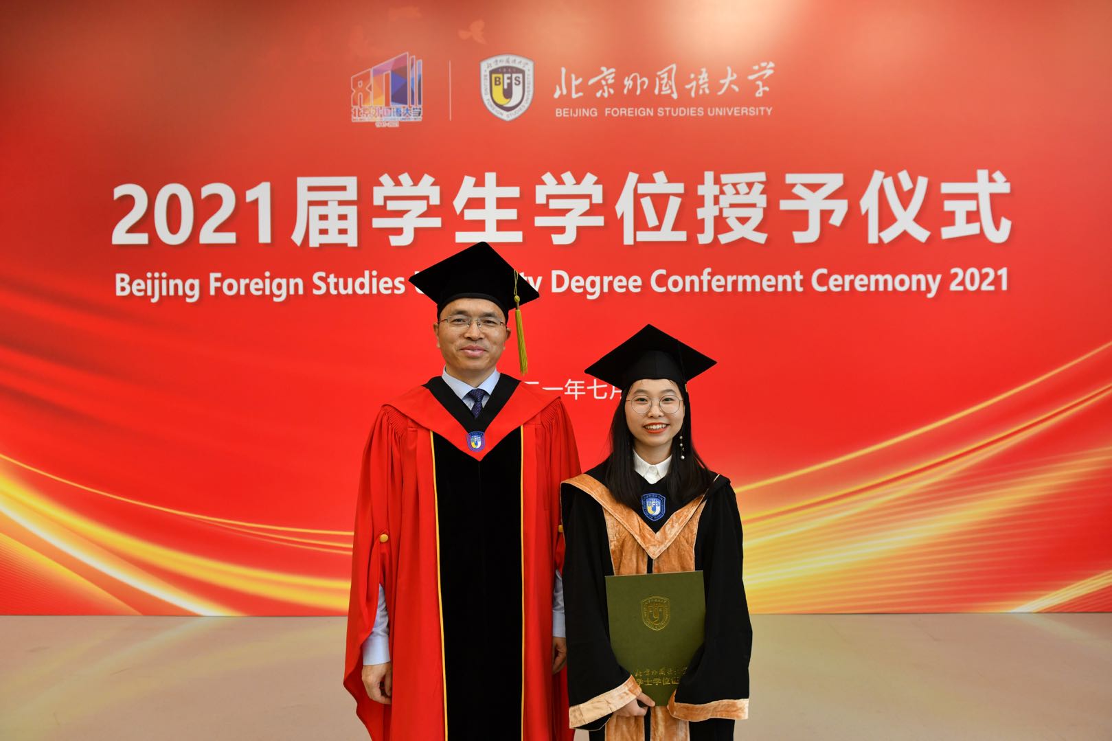 师生于逸夫楼第三阶梯教室参与2021届毕业生学位授予仪式,杨丹校长在“拨穗礼”环节一一与每位毕业生握手、合影,并送上亲切的祝福。