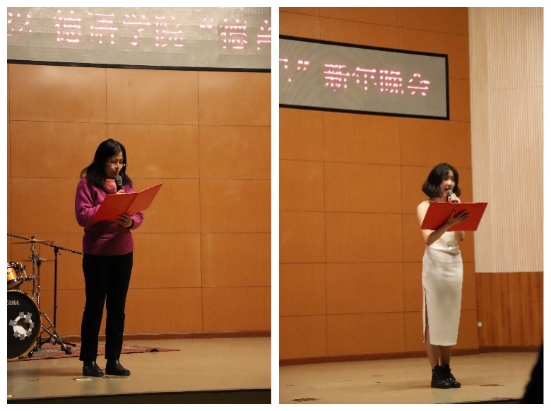 党总支书记常秀鹏与学生郭沈嘉乐合作用中德文朗诵了马克思的经典诗歌《海上船夫歌》,副院长姚燕与学生王颖合作用中德文朗诵了歌德的经典诗歌《中德四季晨昏杂咏》,赢得了同学们热烈的掌声。整场晚会充分展示了金牌影院