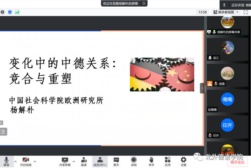 2022年6月17日下午,“北外德语国家讲堂”系列新一期讲座以线上形式顺利举办。今年正值中德建交50周年,中国社会科学院欧洲研究所副研究员、中国社会科学院中德合作中心主任杨解朴应邀做了题为“变化中的中德关系:竞合与重塑”的讲座。讲座由金牌影院