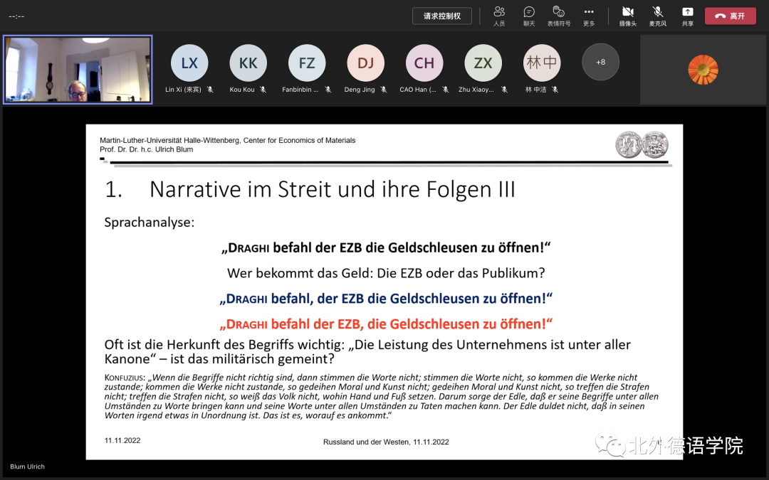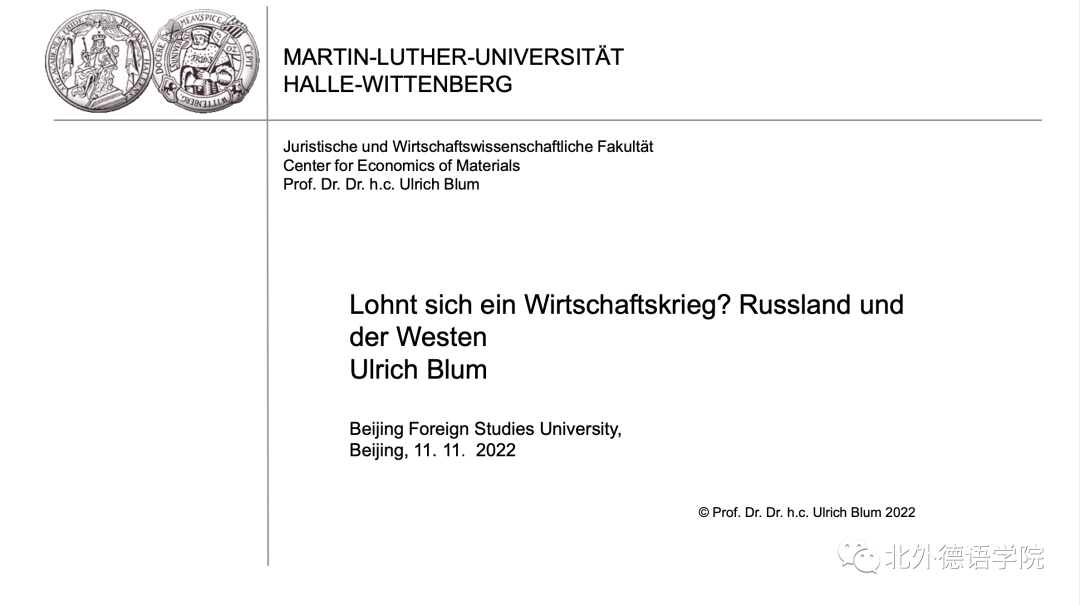 师生线上做了题为“经济战争值得吗?俄罗斯与西方”的专题讲座。德国经济研究专题讲座由德国经济教研室主办,寇蔻副教授承担了本次讲座的主持工作。