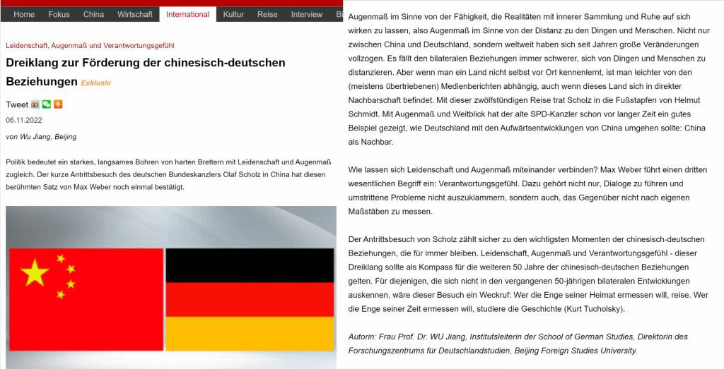 书记、院长吴江教授应中国网邀约用德语就朔尔茨访华发表评论文章。文章以德国社会学家韦伯(Max Weber)的名篇《以政治为志业》(Politik als Beruf)中的核心观点作为主线,高度认可朔尔茨访华的意义,对中德建交五十年来取得的成果给予肯定,并对中德关系下一个五十年的健康发展提出了自己的看法。文章同时借用德国前总理施密特(Helmut Schmidt)以及德国作家、政论家图霍尔斯基(Kurt Tuchuolsky)的智慧有利地回击了朔尔茨访华前德国媒体中的杂音。评论文章刊发后反馈颇佳,在中国网海外平台引发热烈关注,国外读者留言众多,创了中国网德文评论文章互动的新高。