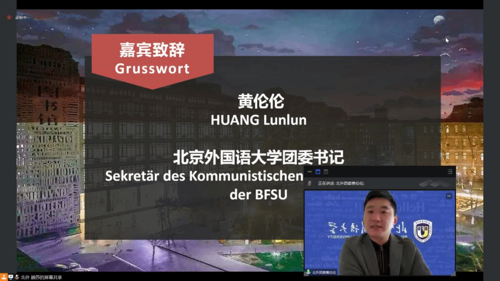 委员会欢迎全国各高校师生参赛,并对大赛的举办表示热烈祝贺。黄伦伦充分肯定大赛取得的成绩,作为全国德语界本科生的传统赛事,大赛旨在以语言为钥匙,以声音为桥梁,搭建促进学生发展的第二课堂平台。大赛不仅是语言技能的比拼,更是文化交流的盛宴。黄伦伦表示期待来自全国各高校优秀选手们的精彩表现,并希望大家借助大赛的平台踊跃交流、增进了解,不断精进语言学习。黄伦伦赞赏今年的大赛初赛选取“故乡”作为关键词,希望参赛学生通过外语学习尽情表达对“他乡”与“故乡”的深刻理解,不断拓展视野。近年来北外共青团组织秉持引领青年思想、服务青年成长的宗旨,不仅在思想引领、组织建设、校园文化、社会实践和志愿服务等方面开展丰富的活动,也非常关注同学们的全面发展和个性发展。校院两级团组织通过承办配音大赛、对象国文化节等活动,为同学们提供了挑战自我、锻炼能力、交流互鉴、拓宽视野的平台。北外金牌影院