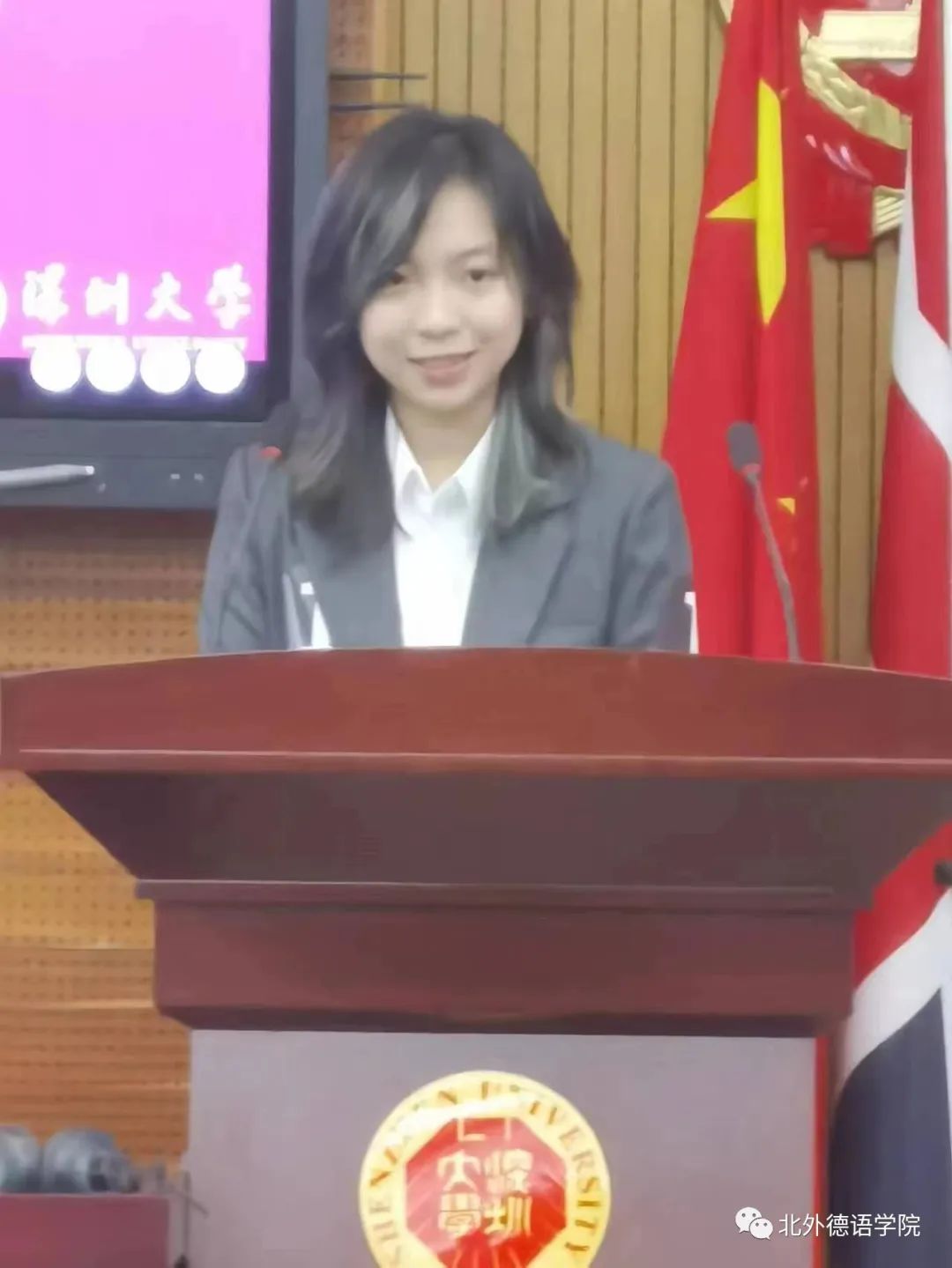 本科一年级学生黄婉茹经过笔试和面试,在德语组共114名选手中位列第一,顺利晋级决赛。在决赛部分,经过德语辩论环节(辩题为:全球化会带来文化趋同/全球化会带来民族文化的勃兴),以及“讲好中国故事”德语即兴演讲与问答环节,黄婉茹总分排名第二,荣获德语组二等奖。辅导教师洪堃绿博士获优秀指导教师奖。