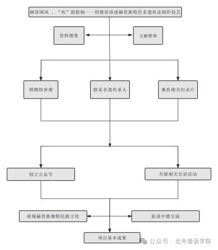 22级本科生白怡心、田润欣、孙尧和亚洲学院希伯来语专业22级本科生侯爽。该项目积极响应总书记增强文化自信,传承并弘扬中华优秀传统文化的号召,选取黑龙江地区赫哲族的非遗鱼皮制作技艺为项目主题,拟对此进行深入研究;通过搜集中德双语文献、探访非遗传承人、参观相关博物馆、展览园等途径,了解探究其历史及发展,并以此为基础进行多平台宣传,组织双语宣讲并开展鱼皮工艺品观看、制作的体验活动。通过本项目的推进实施,将持续向德国输出更多少数民族优秀传统文化,增进中德友谊;进而用德语向世界展现鱼皮文化之美。