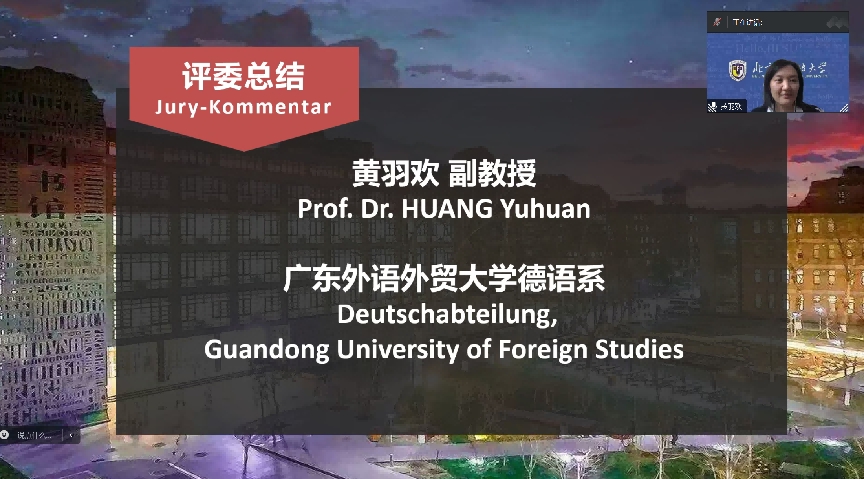 大赛初赛于9点30分准时开始,评委团队采取交叉回避原则分组对参赛作品进行了评审。经过激烈的角逐,共选出10支参赛队伍晋级决赛。广东外语外贸大学德语系副教授黄羽欢和北京理工大学德语系副教授Ulrich Jörg代表全体评委对本次大赛的参赛作品进行了精彩的点评。参赛队伍对作品的理解力以及扎实的语言基本功、积极向上的团队风貌给评委们留下了深刻的印象。评委们对同学们今后的语言学习和专业拓展提出了要求和希望,勉励大家再接再厉,取得更多的成绩。