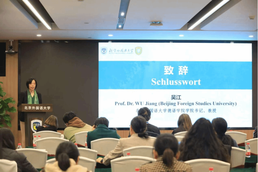 书记、教授吴江为大会致闭幕辞。吴江书记对全体参会专家学者以及为本次会议辛勤付出的会务人员表示了衷心的感谢。她指出,当今世界正处于高度动荡与深刻变革的时代,不确定性的加剧使跨文化沟通的重要性愈发凸显,面对这一时代挑战,语言与交流的方式也在经历前所未有的重塑。2025年被视为人工智能落地的元年,德语学科应以此为契机,在人文与科技的融合中开辟新路径,推动我国德语学科在数智时代实现创新与跃升。