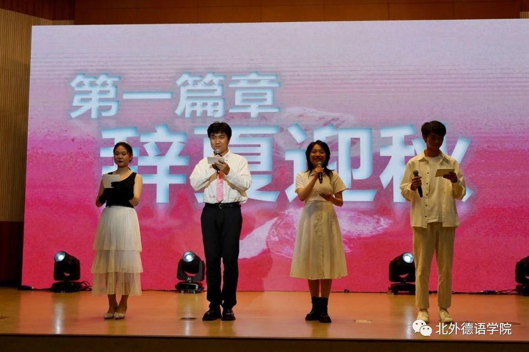 党总支委员、副院长张晓玲、寇蔻,青年教师武迪,22级硕士生姜浩远四人联袂表演中德文诗歌朗诵《秋日诗语》,朗诵了德国经典诗歌里尔克《秋日》、席勒《希望》和马克思经典著作《青年在选择职业时的考虑》(节选),使新生们感受到了德文之美、中文之妙,经典著作的隽永留香。