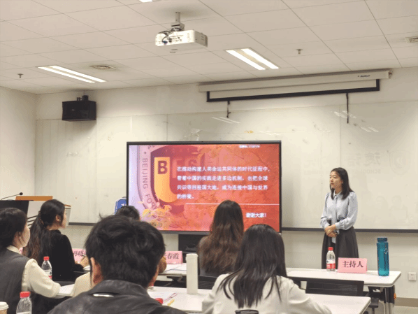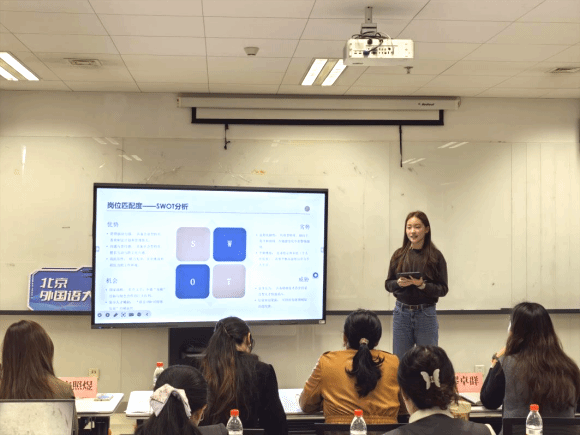 党总支委员、教学秘书于芳,中国银行总行公司金融与投资银行部职员、校友缪卓群,北京大兴精华学校校办研究组组员、校友宋照煜,中国电子系统技术有限公司AI产品经理、校友邸若楠组成。评委团从专业视角出发,对选手的职业规划方案、个人简历、现场展示等进行全面评审。