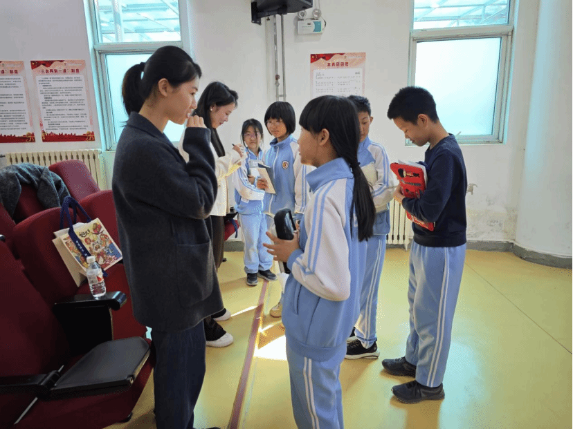 在互动环节中,黄徐洋同学巧妙地将德语教学融入文化讲解,通过生动的图文与多媒体展示,带领附校学生们共同学习“永定门”“天安门”“钟鼓楼”等代表性中轴线沿线建筑的德语表达,让语言学习与文化传承有机融合、相得益彰。同时,北外附校的学生们也在互动环节获得来自德语学院本科生党支部学长学姐准备的德语特色明信片。