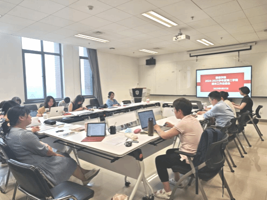 第二个环节是学期工作总结。德语学院基础教研室、研究生教研室、文学教研室、语言学教研室、翻译教研室、外交教研室、经济教研室、跨文化教研室、教师党支部、工会负责教师,党政联席会班子成员依次汇报了本学期的工作开展情况、取得的成绩以及存在的不足。