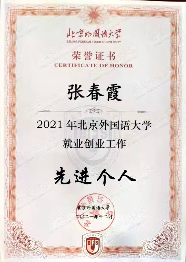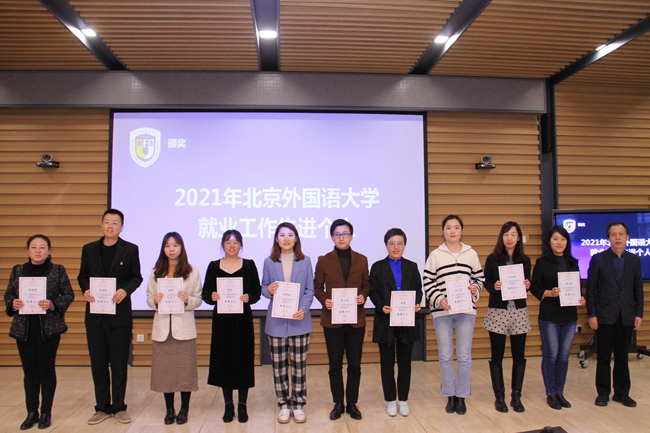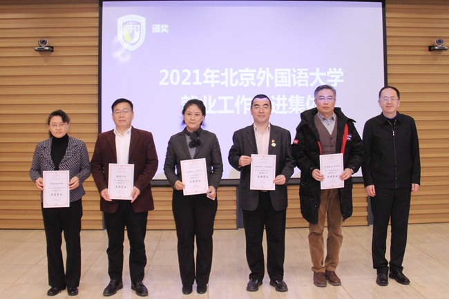 大会对2021年就业创业工作中表现突出的先进集体和个人进行了表彰。德语学院辅导员张春霞等10人荣获“2021年北京外国语大学就业工作先进个人”;德语学院等5个单位荣获“北京外国语大学2021年就业工作先进集体”,德语学院党总支书记常秀鹏代表德语学院领奖。