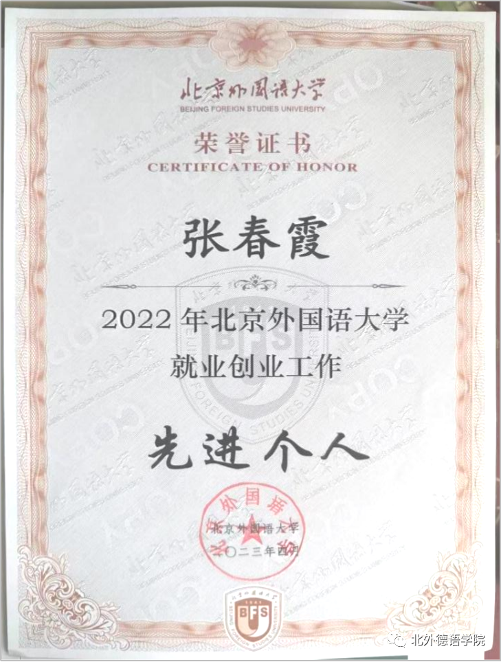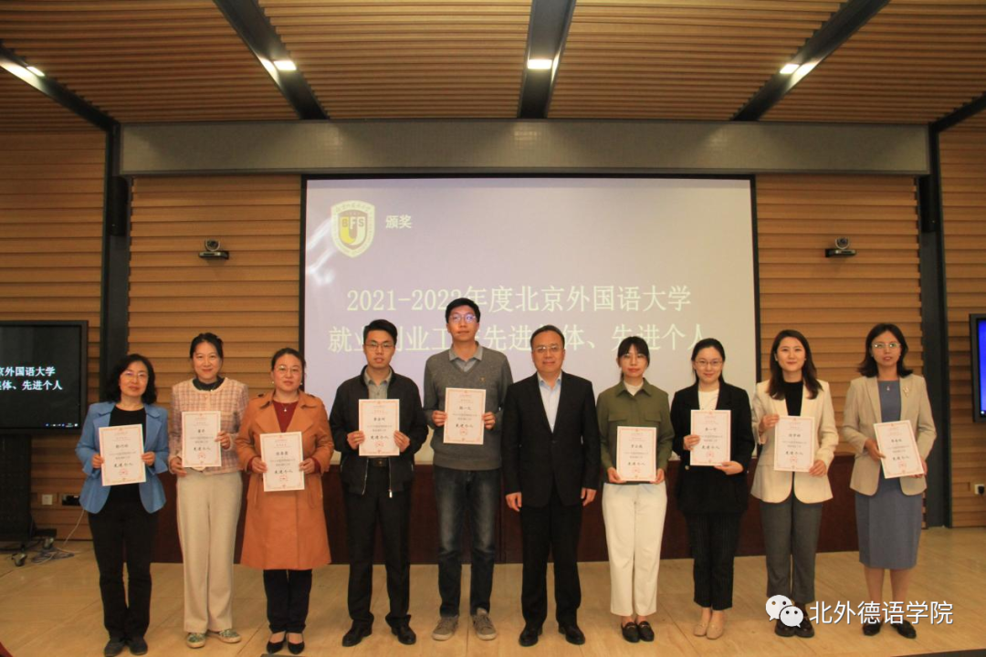 大会对2021-2022学年就业创业工作中表现突出的先进集体和个人进行了表彰。德语学院辅导员张春霞荣获“2021-2022学年北京外国语大学就业工作先进个人”。