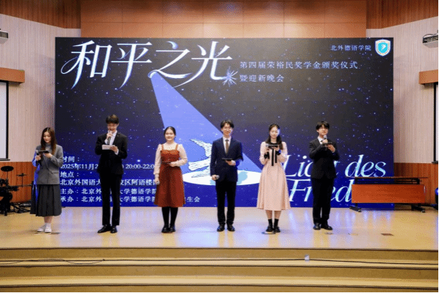 和平的薪火长明,点亮了逐梦的征程与希望。2025年11月2日晚,第四届荣裕民奖学金颁奖仪式暨“和平之光”迎新晚会于阿语楼国会厅隆重举行。本次晚会由北外德语学院主办,团总支学生会承办,在这秋意正浓的美好时刻,为学子搭建彰显风采的舞台,传递和平理想的温度。德语学院本科生方霖城、高浩童、李文婷、祁小涵、石宇凡和张婧琪六名同学共同担任主持人。