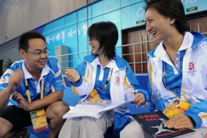 跳水运动历来星光璀璨,中国“梦”之队的美誉更是让全世界习惯性的把目光注视中国。无论是三米板还是十米跳台,无论是个人赛还是双人赛,也无论是预赛还是决赛,混合区始终都被围得水泄不通,大家都想近距离得一睹中国跳水队的当家花旦小生们的风采,郭晶晶、吴敏霞、陈若琳、王鑫、何冲、秦凯、王峰、林跃、火亮……每一个“梦之队”的明星走过,那身中国队耀眼的红色队服总显得如此暖人,那点点脸上还未干去的水珠总显得晶莹剔透。印象最深的是女子双人三米板决赛结束后的采访,郭晶晶和吴敏霞毫无悬念的夺得桂冠,由于媒体运行的人手不足,加之没有德国队的采访任务,我被临时调到混合区协助工作,没想到,当郭晶晶和吴敏霞走到之时,所有的文字记者几乎一拥而上,我就这样被地挤到了最前头,抬眼一看,两位冠军就站在自己面前,此刻,多少人,多少只手,多少麦克,多少录音笔,从我的左右身后一齐伸出,把我的脖子牢牢掐在了千手之间,动弹不得。大家争相发问,我的脖子和小脚也就这么跟着话音传来的方向左挪右移。小心翼翼,怕踩着记者,也怕被聚精会神的记者踩着,那时可就成了踩者无心,痛者无语了。身后一股强大的力量始终源源不断地向我推来,使我不断地前倾,挺住,后仰,失去平衡……终于还是站稳了,我拿出了笔协助媒体运行记者采访记录,运动员认真地回答,我在纸上刷刷的画着自己的符号,这一瞬间,我目睹了最真实的新闻人的世界,很挤却很充实,更重要的是奋力工作后的乐趣,他人对自己笔下的那份新鲜期待。