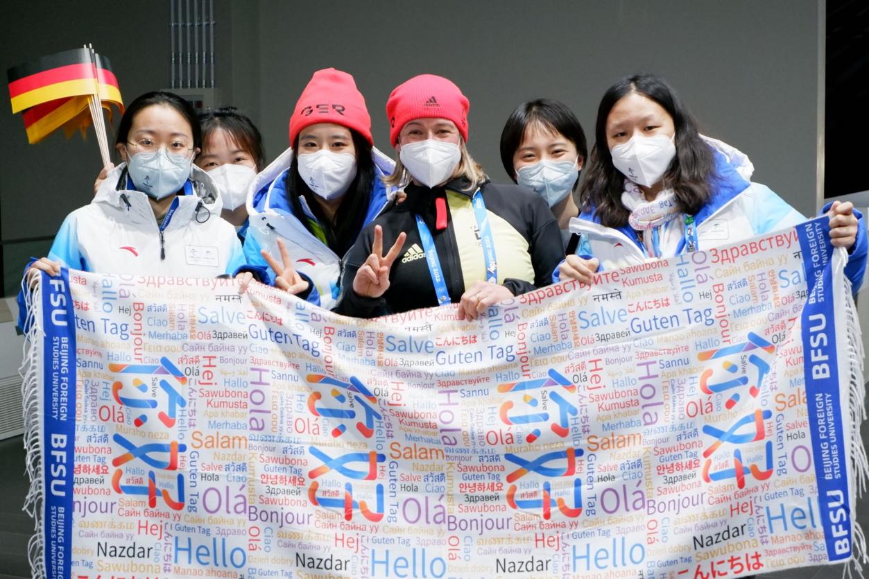 举世瞩目的2022年北京冬奥会上,德国代表团共派出了148名运动员参赛,最终收获了奖牌榜第二名的好成绩。来自北京外国语大学德语学院的研究生孙文菊、张楠、赵馨茹和本科生李嘉俊、万思妤在赛会期间担任北京冬奥村德国代表团助理,提供语言支持服务,全方位保障德国运动员的“衣、食、住、行”,涵盖抵离入住、交通物流、卫生防疫、赛事信息、资料准备等各个方面,她们出色的后勤保障工作助力德国代表团在本届冬奥会上取得了优异的成绩。