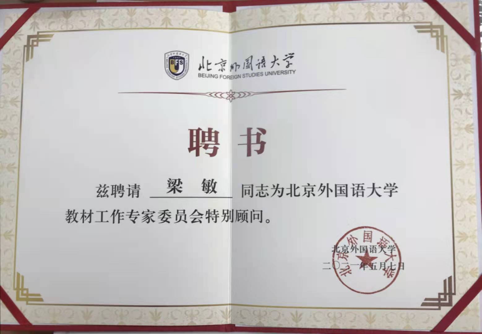 为发挥教材专家对教材建设的指导作用,学校成立了教材工作专家委员会。德语学院梁敏教授被聘为北京外国语大学教材工作专家委员会特别顾问。学校党委书记王定华为教材工作专家委员特别顾问代表颁发聘书。