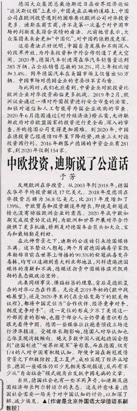 2021年1月30日,北外德语学院于芳副教授在《环球时报》第7版国际论坛版发表《中欧投资,迪斯说了公道话》一文。