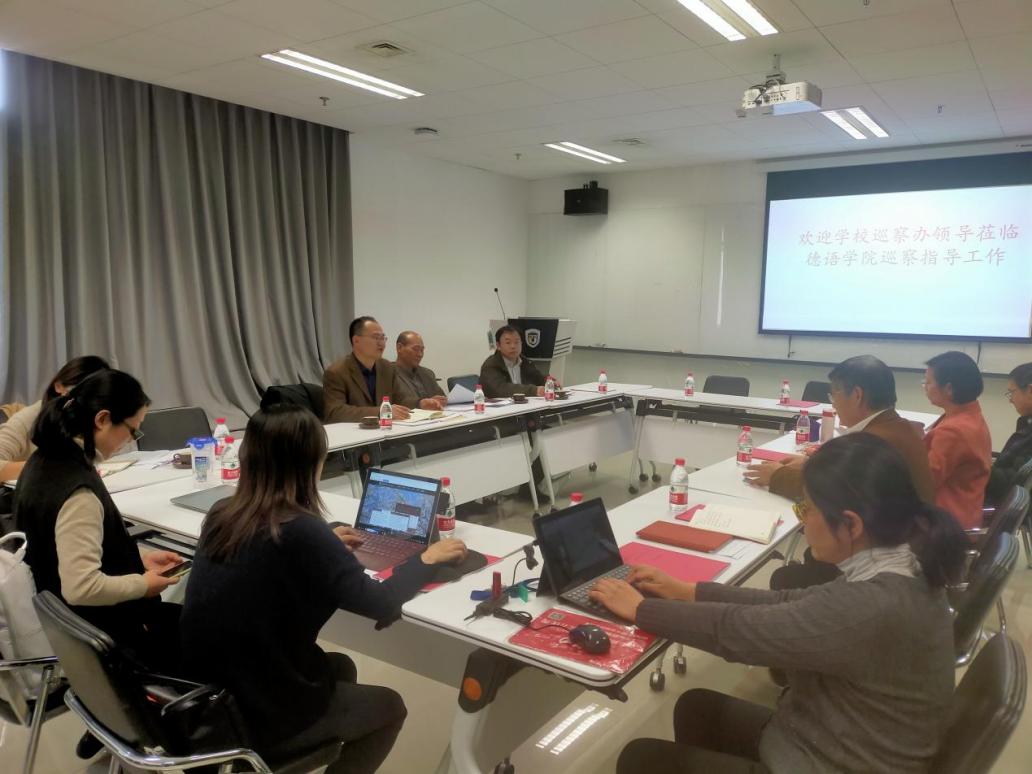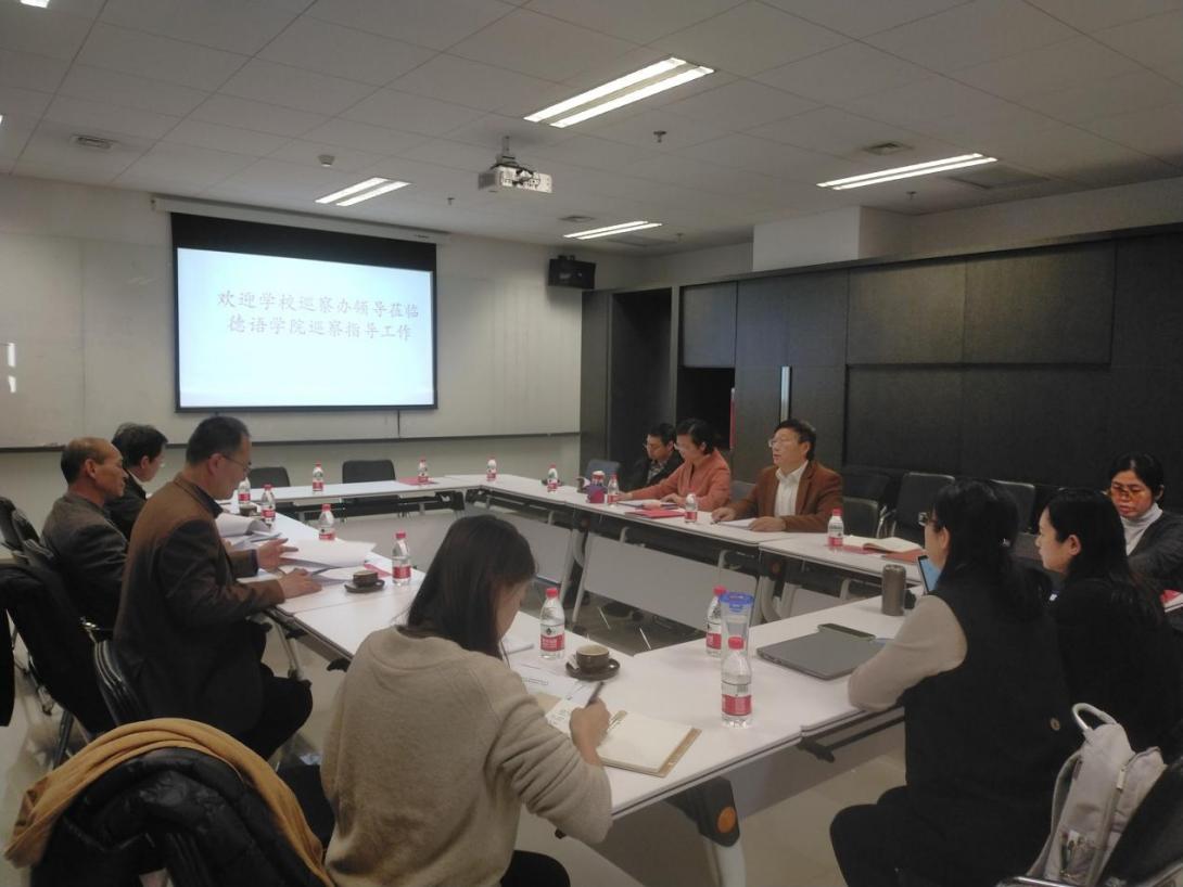 2021年11月25日下午,校党委常委、统战部部长、巡察办主任刘培元,纪委副书记、纪委办公室主任李正玉,组织部常务副部长冯刚、正处级巡察专员相忠群、巡察办副主任杨光等同志走访德语学院,检查德语学院落实校党委巡察“回头看”反馈意见整改情况,学院党政联席会成员和党总支委员参加座谈。