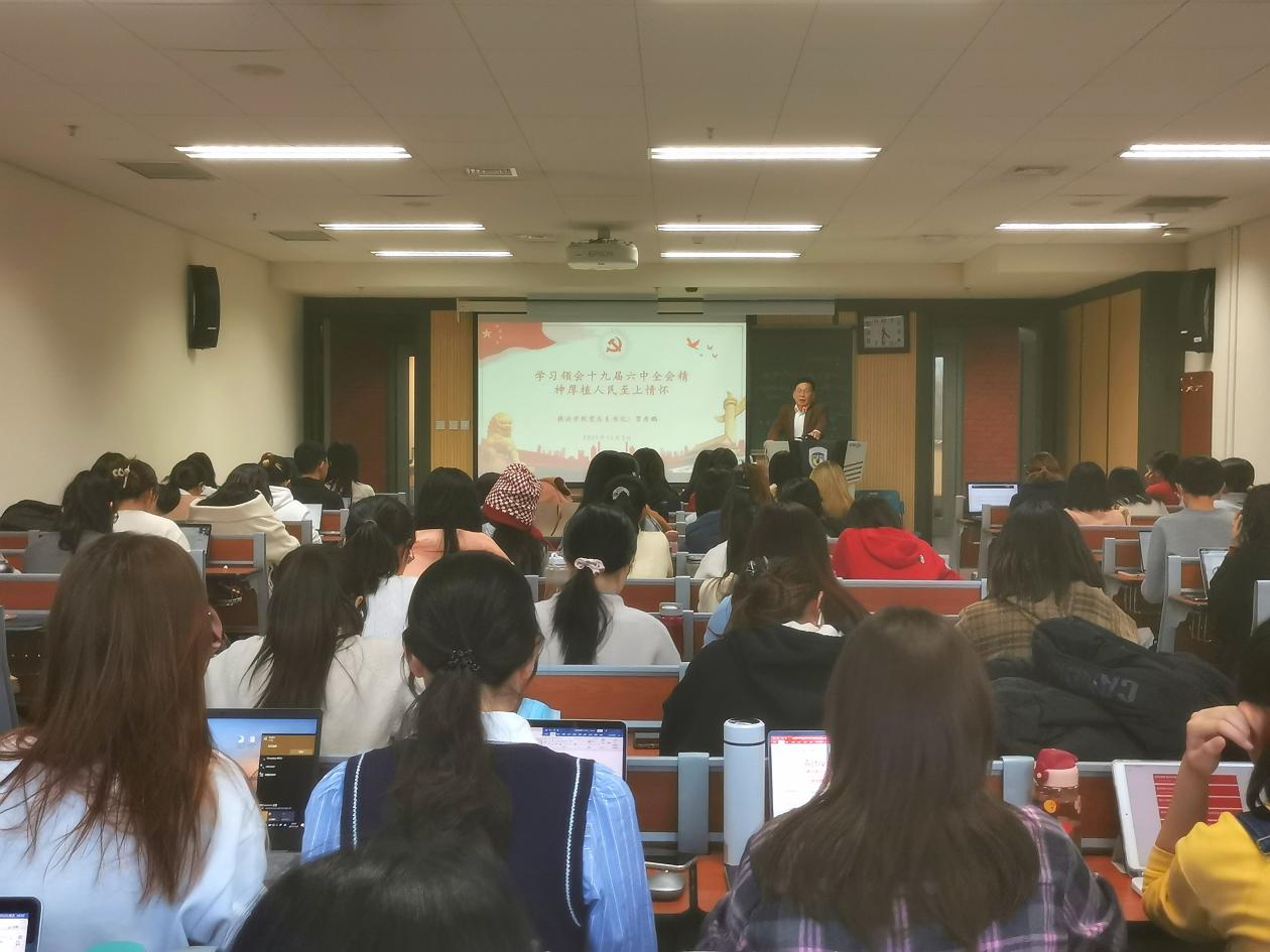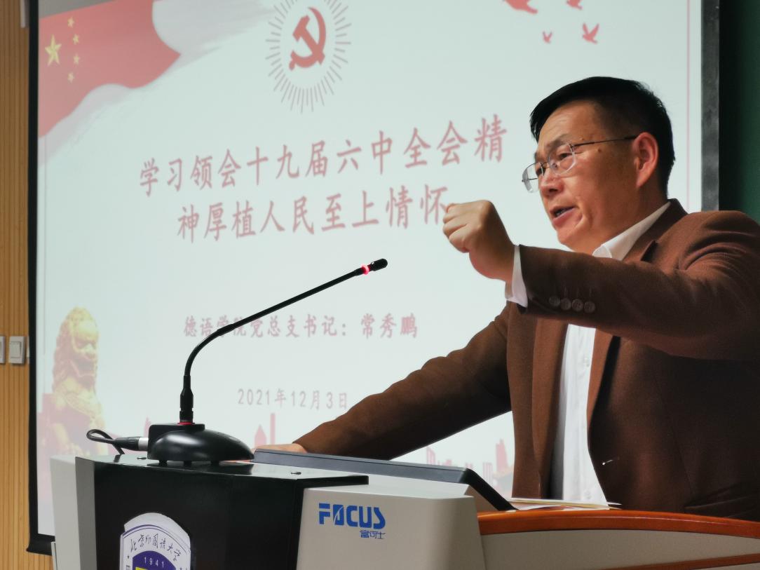 为深入贯彻校党委关于学习党的十九届六中全会精神的要求,提高广大学生党员、入党积极分子的思想觉悟和理论水平,12月3日下午4:30,在国际大厦413教室,德语学院举行“党总支书记讲党课”集体学习活动。学院党总支书记常秀鹏为本硕博学生党员、入党积极分子80余人讲授了以“学习领会十九届六中全会精神,厚植人民至上情怀”为主题的党课。辅导员张春霞、粟靖淳参加了学习活动。