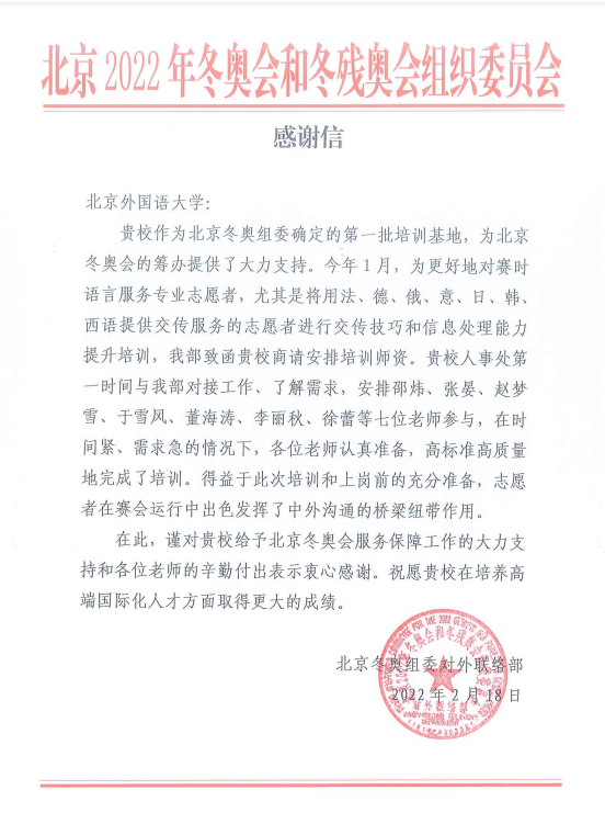 德语学院教师张晏于2022年1月26、27日,受北外委派,为北京冬奥会赛时语言服务专业志愿者提供交传服务的志愿者进行交换技巧和信息处理能力提升培训。张晏老师与法、俄、意、韩、西等语种老师认真准备,在时间紧、需求急的情况下,高标准高质量地完成了培训。北京2022年冬奥会和冬残奥会组织委员会在2月18日向北京外国语大学发来感谢信,对张晏老师等七位参与培训教师的辛勤付出表示感谢,并指出得益于此次培训和上岗前的充分准备,志愿者在赛会运行中出色发挥了中外沟通的桥梁纽带作用。张晏老师表示非常开心能为北京冬奥会贡献自己的力量。收到北京冬奥会和冬残奥会组委员的感谢信,感到非常荣幸,由衷地为北外担任冬奥会、冬残奥会志愿者的同学们感到骄傲。以下为张晏老师撰写的心得体会。