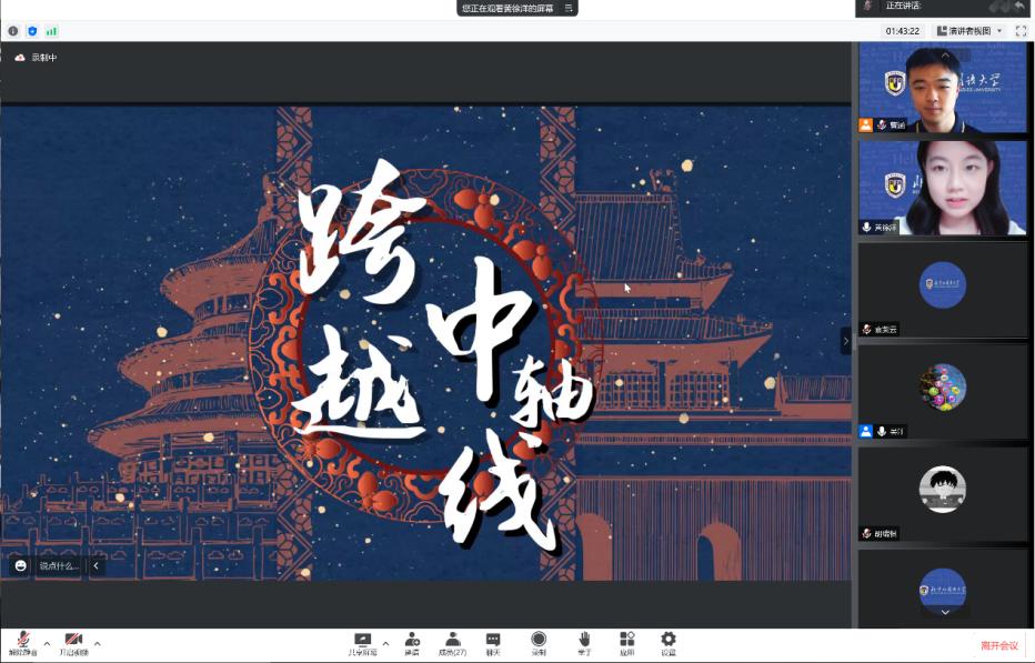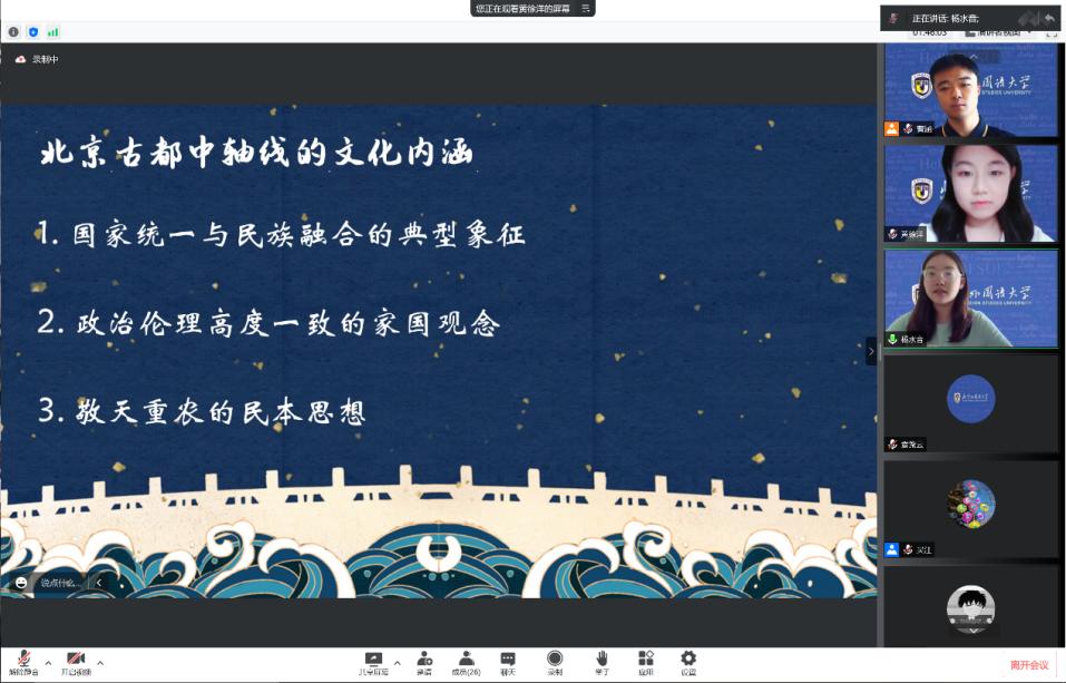 报告会后的交流环节,北外“中轴线”系列项目发起人、德语学院19级本科生曹涵首先发言。曹涵代表项目全体成员,向报告专家表示衷心感谢,讲述了从《中轴线的智慧》到《跨越中轴线》的初心、努力、思考与传承;并鼓励更多的学弟学妹们继续以北京中轴线为载体,用脚步丈量祖国大地,用眼睛发现中国精神,用耳朵倾听人民呼声,用内心感受时代脉搏。接下来,《跨越中轴线》大创项目负责人,德语学院21级本科生黄徐洋介绍了项目团队的阶段性成果与研究开展思路:《跨越中轴线》项目以中德建交五十周年为背景,聚焦北京与柏林城市中轴线的变迁,结合中德文化外交、中德跨文化交际等学科方向,开展一系列课题研究与实地调研。黄徐洋向报告专家请教:北京中轴线应如何突破城市、地域的界限,最终走向中国,走向世界?随后,《跨越中轴线》北京市暑期社会实践项目负责人、德语学院21级本科生杨水音介绍了项目团队梳理的北京中轴线文化内涵六大核心理念,并向报告专家虚心请教:如何将文化内涵、文化价值观更好地运用于讲好中国故事的实践?