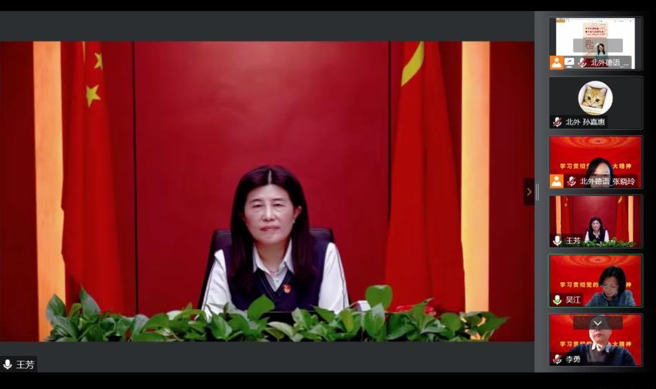 为深入学习贯彻党的二十大精神,2022年12月7日,德语学院党总支邀请外研社党委书记、社长王芳为德语学院师生党员做题为“讲好中国故事 提升国际传播能力——以实际行动落实党的二十大精神”的宣讲。德语学院党总支书记、院长吴江,党总支副书记李勇,德语学院师生党员、入党积极分子以及来自全国不同高校的师生共计百余人在云端聆听了宣讲会。宣讲会由德语学院党总支纪检委员、德语学院教师党支部书记张晓玲主持。