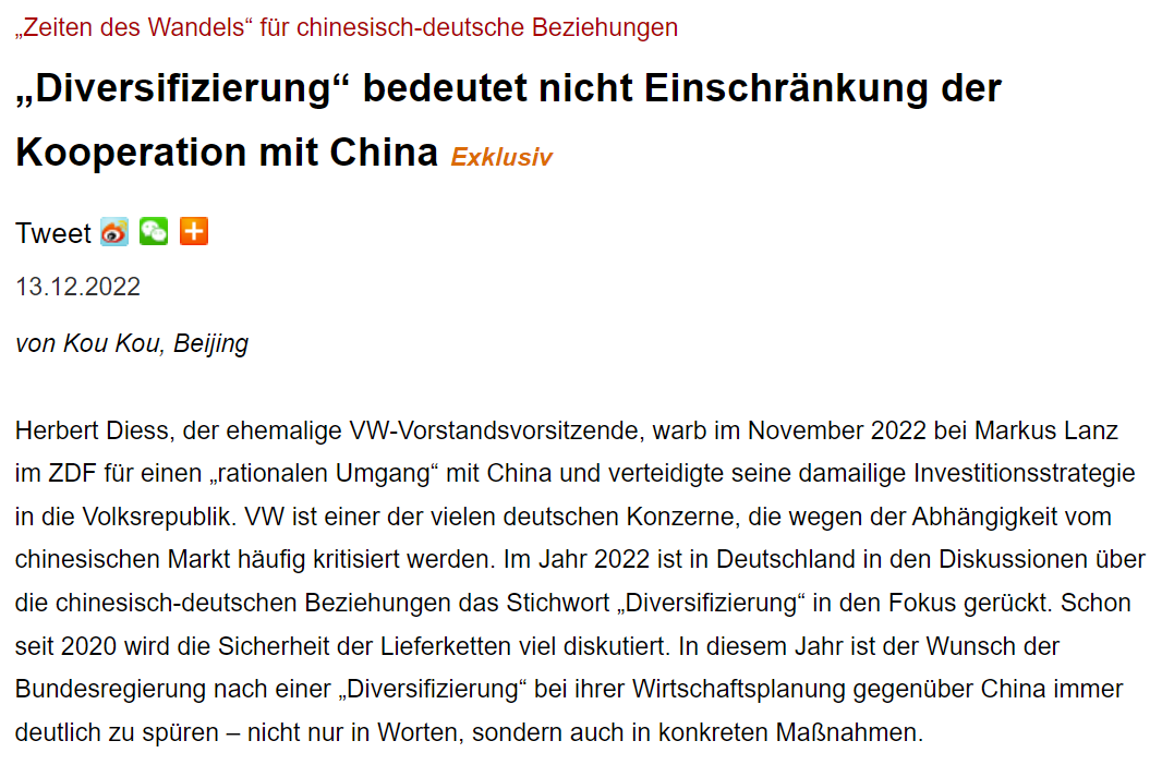 2022年12月13日,北外德语学院副教授寇蔻在中国网就2022年中德关系发表德语文章。文章认为, 2022年的内忧外患让德国进一步加深了关于对中国依赖的担忧,德国政府采取了一些实际措施意图降低对华依赖,例如加强中国企业投资的安全审查、调整对外投资促进政策等。但是中德之间已经形成了紧密的合作关系,双边经贸关系在疫情期间仍保持上涨,体现了足够的韧性和高度的融合。德方的多元化战略不应以限制对华合作为目的。