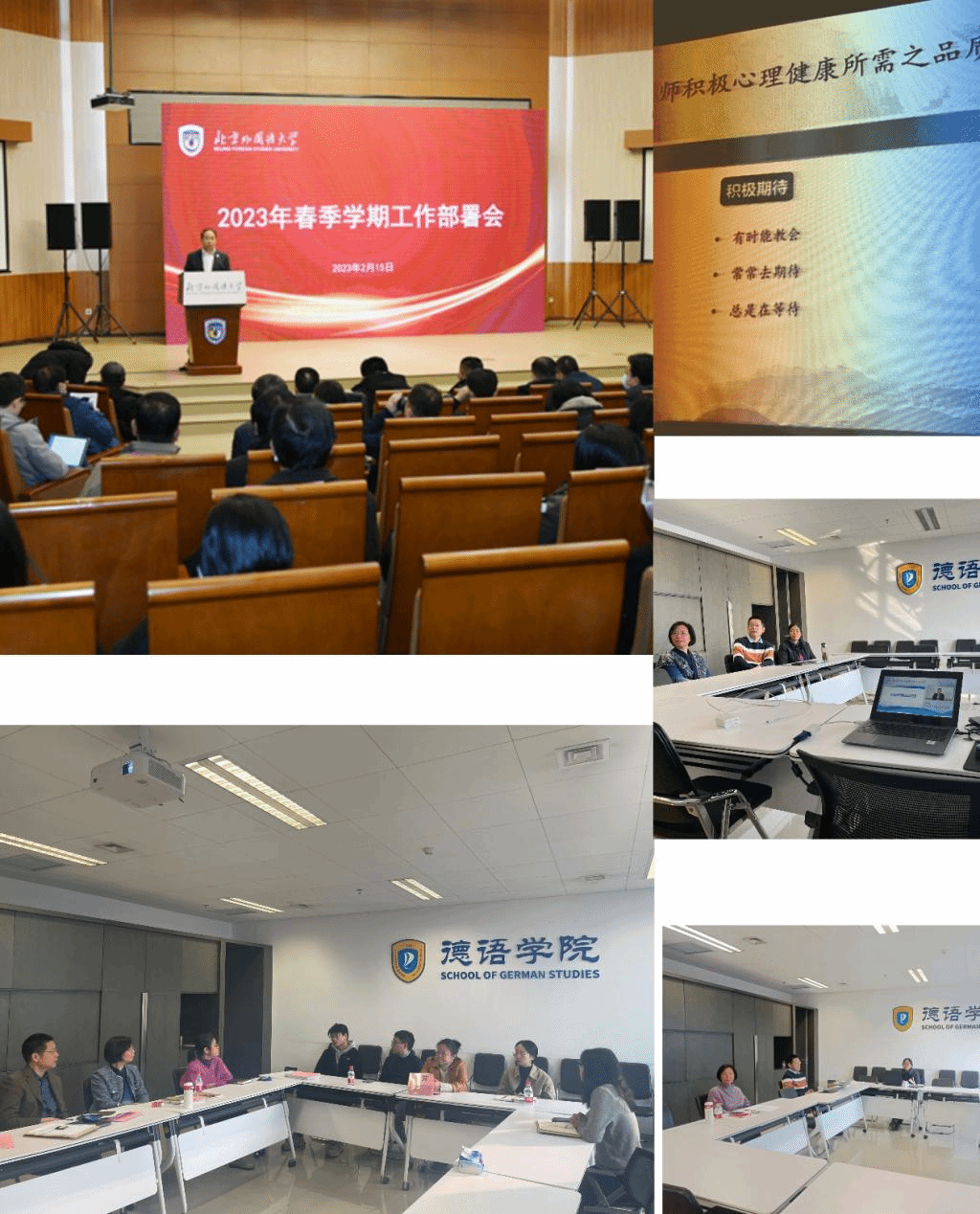 2月15日上午,德语学院党总支全体处级领导干部参加学校春季学期工作部署会,深刻领悟会议精神和工作部署。德语学院师生要结合学习贯彻“党的二十大”精神和习近平主席给北外老教授的重要回信内容,在“以中国式现代化全面推进中华民族伟大复兴”理念指导下,始终高扬干事创业的精气神,抓住新机遇、迎接新挑战,以奋进拼搏开辟未来,展现更加奋发的面貌,立足岗位、做出成绩,推进学院各项事业平稳较快高质量发展。