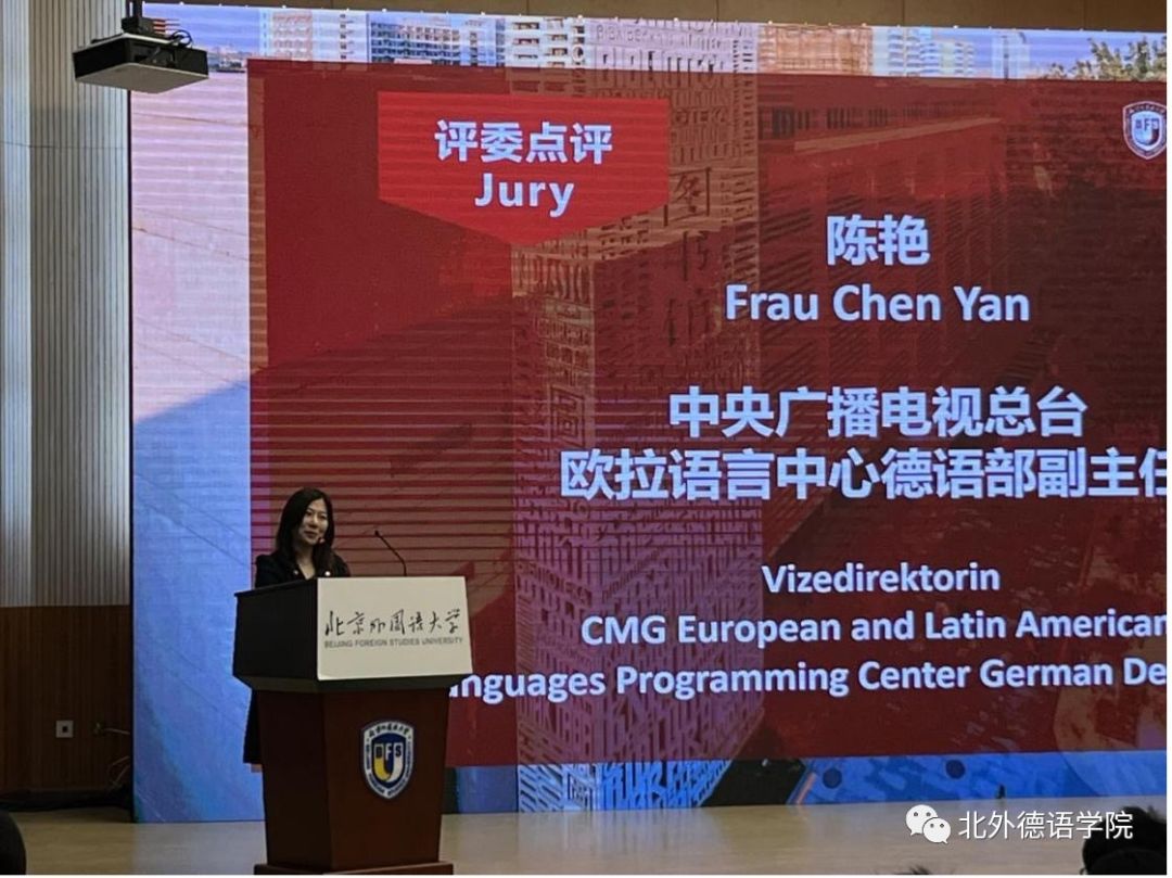 本届大赛决赛邀请了贾建新参赞、北外山东校友会会长、青岛鸿裕吉交通装备有限公司总经理秦思刚、中央广播电视总台欧拉语言中心德语部副主任陈艳以及中国网德语频道主编任斌担任评委。赛事环节由北京外国语大学德语学院2019级本科生曹涵和2022级本科生黄婉茹用中德双语主持。