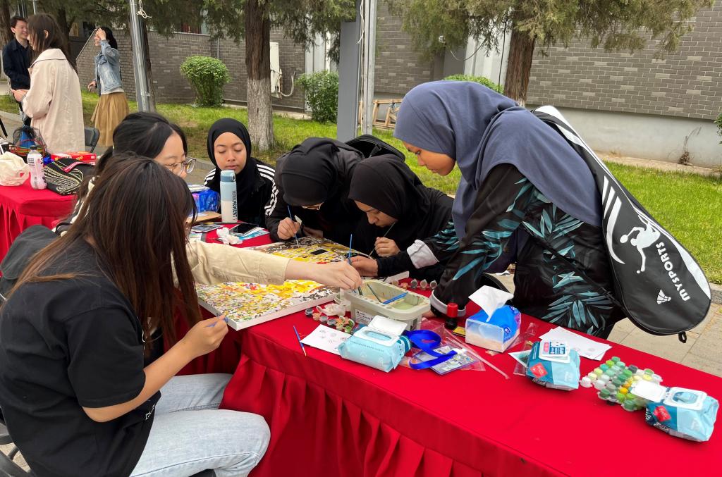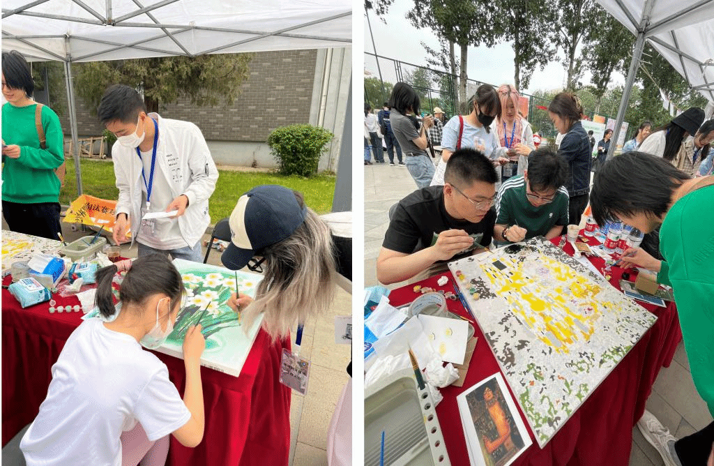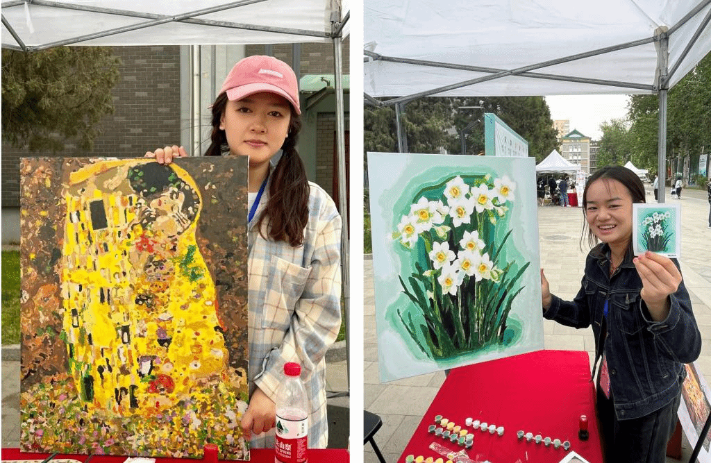 德语学院研究生会学术文体部的展台吸引了不少同学,还包括许多外国留学生。在这儿,可以和大家一起绘制一束惟妙惟肖的水仙花,或临摹奥地利画家克利姆特(Gustav Klimt)的著名代表画作,或是亲手DIY一幅涂鸦,画下今日心情,将这份珍贵的记忆留存于纸上。