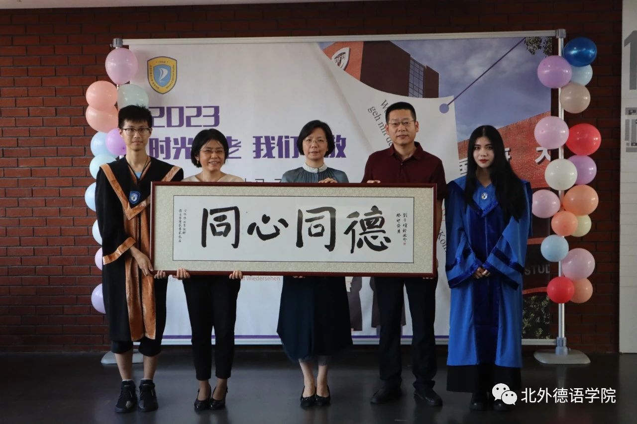 最后党总支书记、院长吴江做春季学期工作的总结汇报。对照学期初工作重点汇报了德语学院本学期在学习贯彻二十大精神、师德师风建设、课程思政、本科教学、教材编写、科研、招生、就业等方面的工作进展,同时汇报了以“洛克与中国”主题展、奥地利文化巡礼、第五届全国高校本科生德语配音大赛、“音乐之声”初夏晚会以及北外德语国家讲堂系列学术报告等为主体活动的德语学院“春之声”文化节——“邂逅奥地利”的举办情况,对积极参与和筹办各项活动的师生表示诚挚的谢意。临近期末,师生团结一心,成功接待德国社民党联合主席克林贝尔一行,为中德人文交流尽了绵薄之力。总结会的最后,吴江代表学院感谢校友给与学院各项工作的鼎力支持,对本学期在教学、科研、管理各领域获得奖励的师生表示由衷的祝贺,并给各位老师展示了2023届毕业生向学院赠送的“同心同德”的书法作品,希望师生“同心同德”,守正创新,踔厉奋发,共同推动学院各项工作高质量发展。