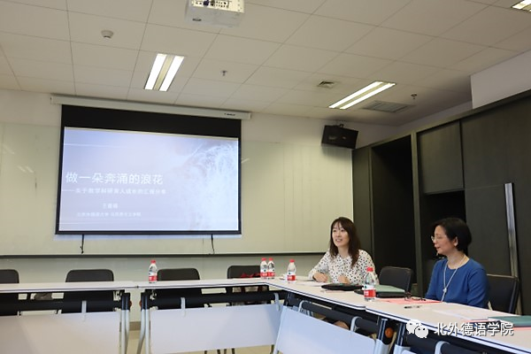 第一环节是德语学院学术周会议。北外马克思主义学院副院长、卓越青年教师王曼倩副教授应邀为德语学院全体教师做主题讲座。王曼倩老师以“做一朵奔涌的浪花”为主题,分享了个人教学科研育人成长的经历。“时间会回答成长,成长会回答梦想”。王曼倩老师结合个人在北外任教九年以来在科研探索、教学实践、成长育人等方面的困难、困惑,及个人如何成长发展的经验和心得感想,提出教学、科研、社会服务不是互相排斥,而是互相支撑,可以提供多角度多维度看问题的视角。青年教师应尽可能融入学校学院发展,多贡献个人的力量;应明确个人的目标,做好教书育人,并经常反思个人成长的不足。王曼倩老师的讲座引起了参会教师的共鸣,大家深受启发,获益良多。德语学院青年教师徐若楠、孙嘉惠、陆娇娇就如何破解科研压力,不断提升教学技能等方面向王曼倩老师请教,王曼倩老师耐心细致地回应了老师们的提问,谈了个人的想法及心得。党总支书记、院长吴江代表学院感谢王曼倩老师的精彩分享和指导,希望德语学院与马克思主义学院未来加强合作和研讨。