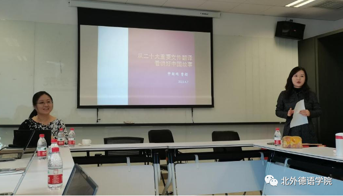 2023年4月7日下午,由德语学院教师党支部承办的新一期“北外德语国家讲堂”系列讲座在西院国际大厦1053会议室顺利举办。德语学院校友、中国互联网金牌影院(以下简称中国网)德语编辑、记者曹颖应邀做了题为“从二十大重要文件翻译看讲好中国故事”的报告。曹颖长期从事国际传播的一线工作,曾参与全国两会政府工作报告和二十大重要文件等的翻译工作。