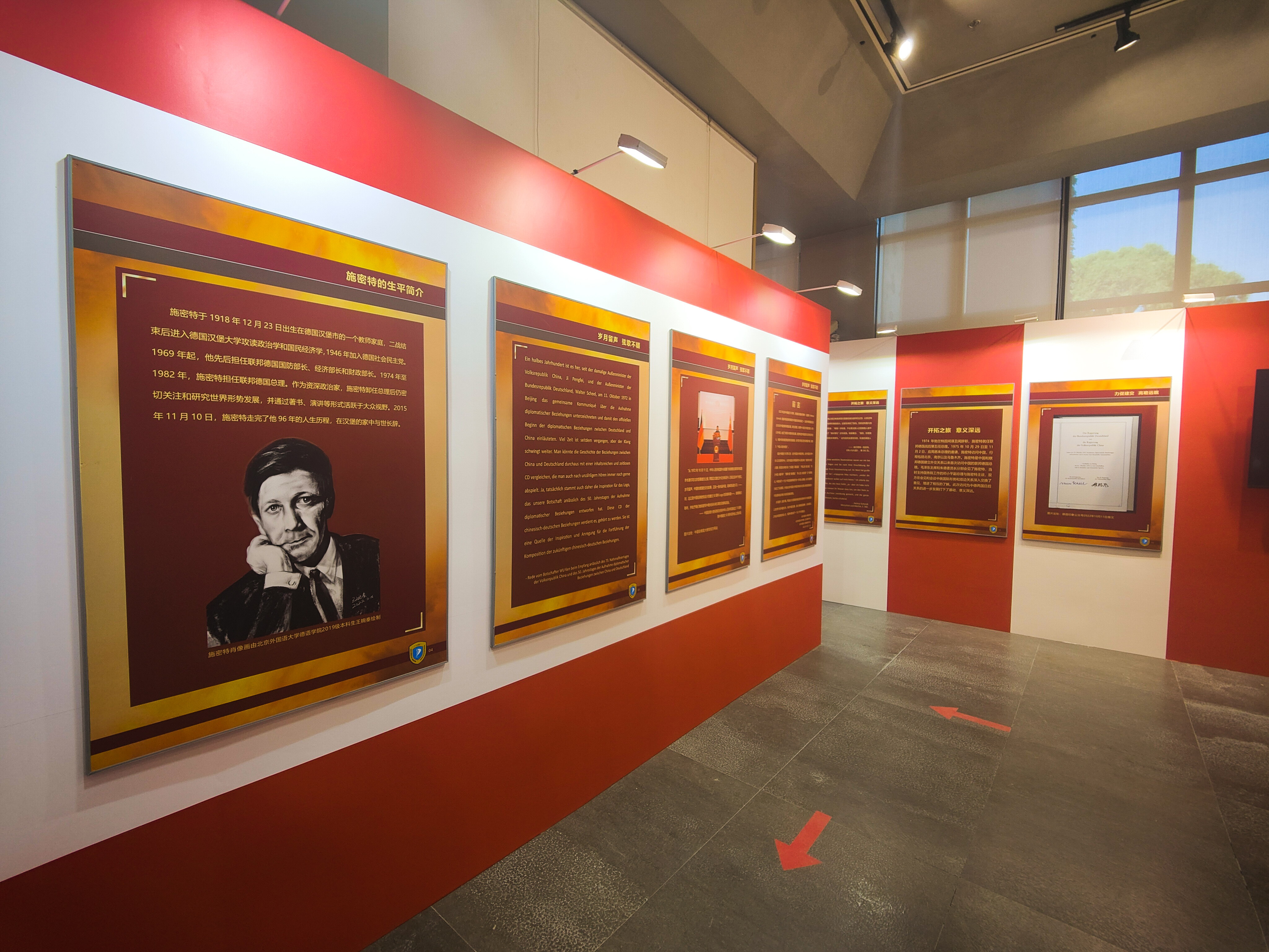 为纪念中德建交50周年,北京外国语大学德语学院、北京外国语大学中德人文交流研究中心、北京外国语大学德国研究中心于2022年10月18日至11月底推出了“施密特与中国”主题展,展览的主体部分由“力促建交 高瞻远瞩”“开拓之旅 意义深远”“关注中国 步履不停”“理解中国 笔耕墨耘”“斯人已去 余音犹存”五个篇章组成。中德关系下一个五十年的发展寄希望于新一代年轻人的推动,主题展特别设立了互动展区,介绍由北京外国语大学德语学院本科生团队承担的国家级大学生创新创业训练计划项目的建设情况。