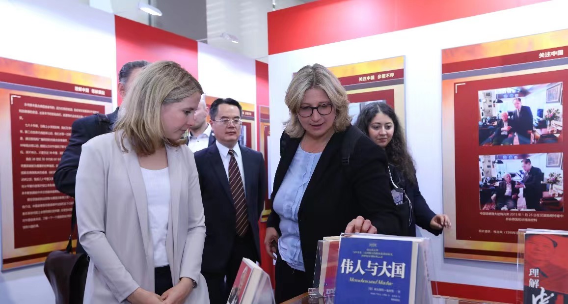 施密特一生撰写了多部以中国为主题或与中国相关的论著,许多著作的中译本都凝聚了北外校友的心血,例如中国前驻德国大使梅兆荣先生领衔翻译的《与中国为邻》(Nachbar China)、《伟人与大国》(Menschen und Mächte)以及已故北外德语学院教授刘芳本老师领衔翻译的《行动起来 为了德国》(Handeln für Deutschland)等。展板的第四板块“理解中国 笔耕墨耘”展出了施密特经典著作的德文版以及中译本。克林贝尔在得知北京外国语大学图书馆藏有诸多施密特著作及中译本后表示非常感动。代表团全体成员在书籍前停下脚步,认真翻阅,并对北外德语学科点在人才培养领域做出的杰出贡献表示赞赏。