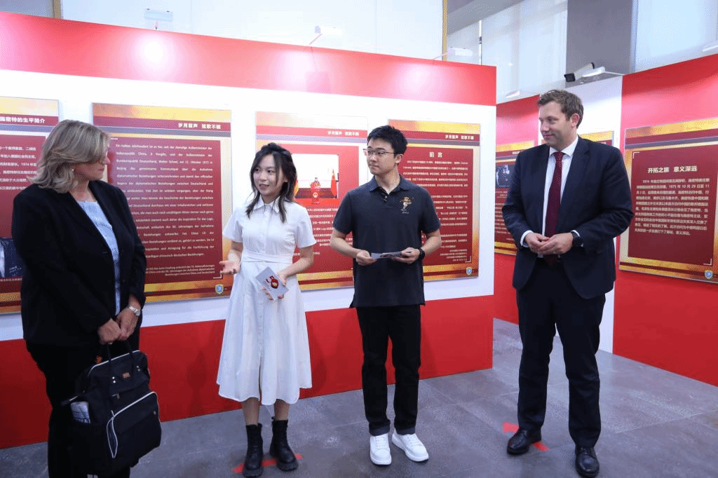 德语学院2019级本科生曹涵和2022级本科生黄婉茹为克林贝尔一行担任志愿讲解员。两位学生精彩的讲解以及热情洋溢的精神面貌赢得了德方嘉宾的称赞。