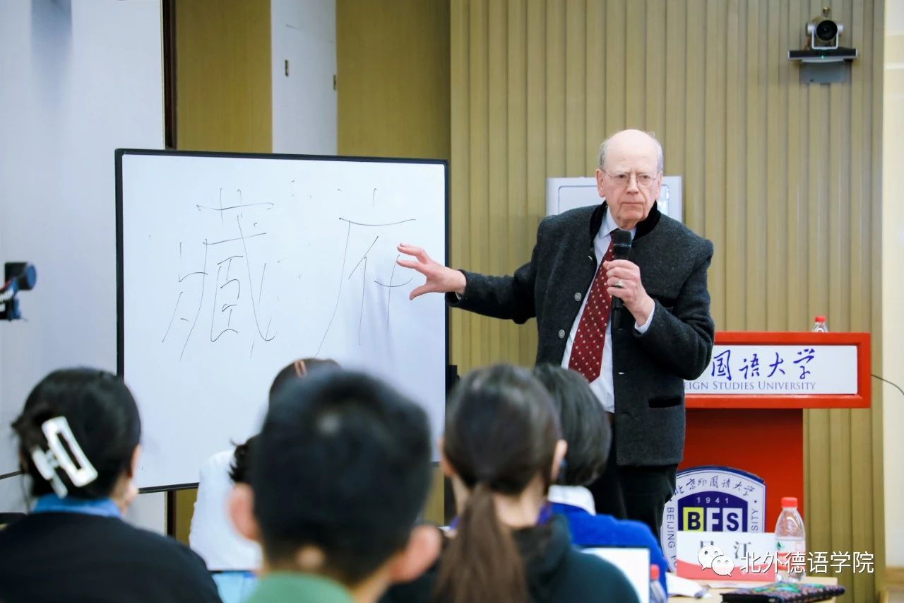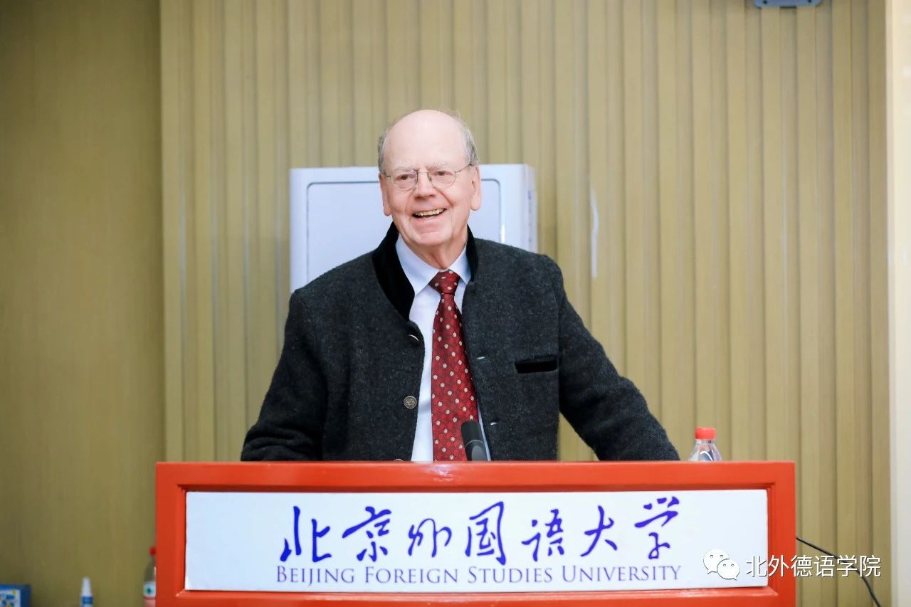 2023年10月18日下午,北外德语国家讲堂系列报告“中医古籍翻译的体会与心得——以《本草纲目》的翻译为例”在北京外国语大学东院晨读厅成功举办。报告主讲人为德国著名医史学家、翻译家文树德教授(Prof. Dr. Paul U. Unschuld),专攻中、欧医学及生命科学比较史,尤擅长医学思想史、伦理史研究。文树德教授夫人文淑德女士(Ulrike Unschuld)、北京外国语大学德语学院1977级校友、德国Rolux Leuchten GmbH 公司创始人、中国赛尔富电子有限公司董事荣裕民先生,德语学院党政联席会成员、教师代表及近百名学生聆听讲座。讲座由德语学院党总支书记、院长吴江主持。