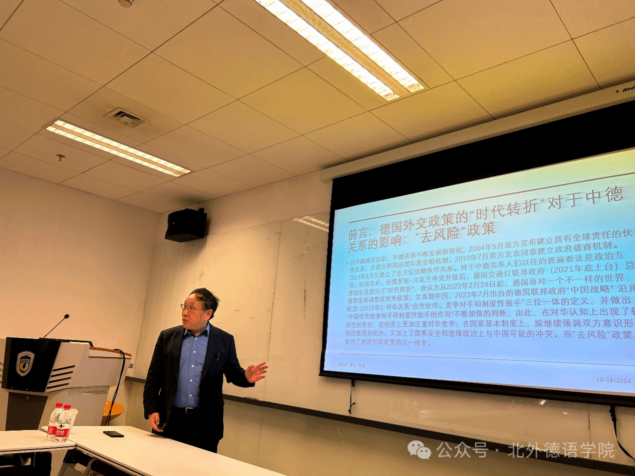 2024年10月28日,对外经济贸易大学外语学院史世伟教授应邀来到北京外国语大学德语学院作题为“德国对外政策的‘时代转折’对中德关系的影响”的主题学术讲座,本次活动系北京外国语大学德语学院人文社科通识系列讲座第11讲。讲座由德语学院副院长寇蔻主持。