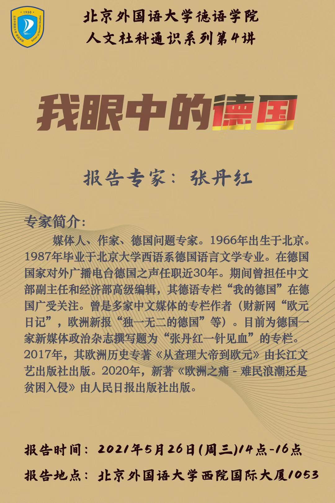 2021年5月26日下午,德语学院人文社科通识系列讲座第4讲在北外西院国际大厦1053会议室举行。资深媒体人张丹红女士应邀作了题为“我眼中的德国”的讲座。讲座由德语学院院长吴江主持。