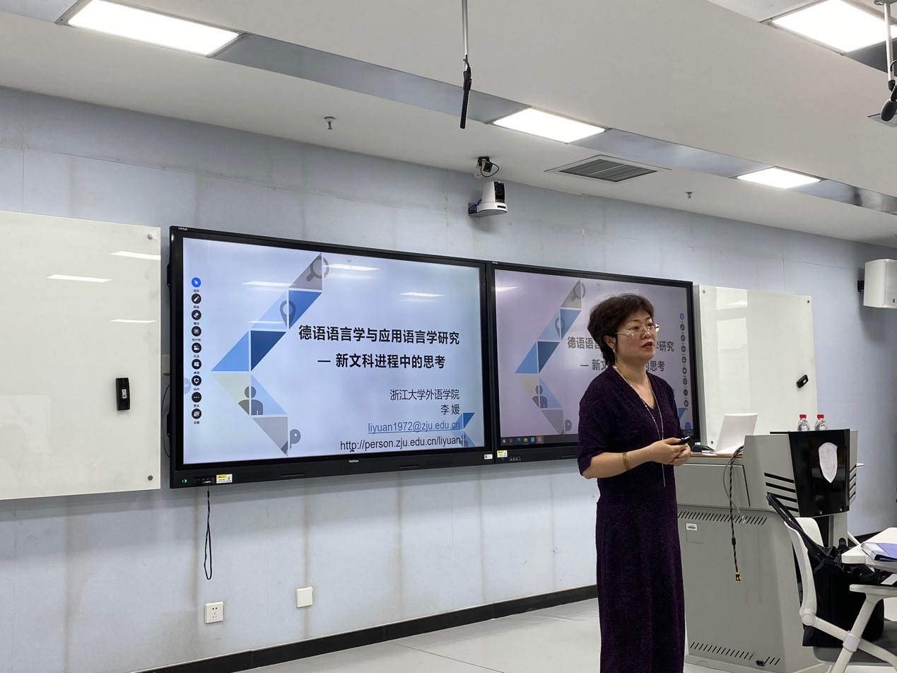 2021年6月25日下午,北京外国语大学德语学院人文社科通识系列讲座第5讲在国际大厦517教室举行。浙江大学外国语言文化与国际交流学院副院长、德国学研究所所长李媛教授应邀作了“德语语言学及应用语言学研究——新文科进程中的思考”的报告。德语学院教师与本科生、研究生代表参加了报告会。讲座由德语学院院长吴江教授主持。