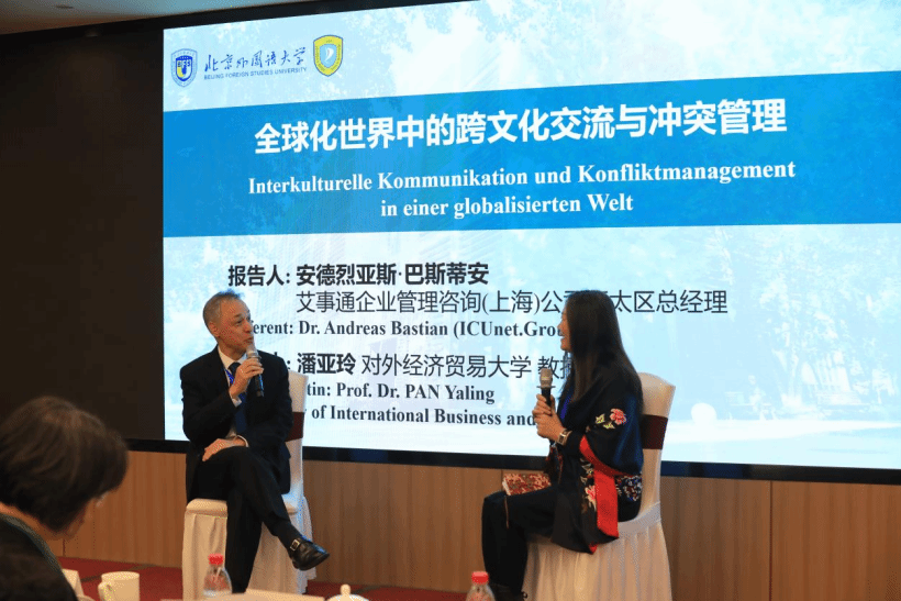 艾事通企业管理咨询(上海)公司亚太区总经理安德烈亚斯·巴斯蒂安(Andreas Bastian)以《全球化背景下的跨文化沟通与冲突管理》为题进行了报告。他结合鲜活的数据分析与企业实例,剖析了跨国企业在全球化运营中面临的沟通障碍与文化冲突。他认为,冲突并非纯粹消极现象,也是跨文化理解的重要契机,关键在于能否以开放的视角去重新定义差异。对外经济贸易大学外语学院教授潘亚玲作为对谈人,围绕“多元化”在跨文化能力培养中的影响、人工智能在跨文化能力训练中的潜力等主题展开深入交流,提出教育与企业实践层面新的思考。