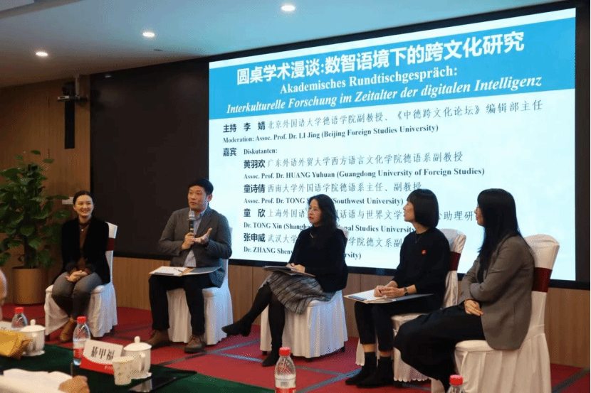 分论坛结束后,圆桌学术漫谈环节在北外德语学院副教授、《中德跨文化论坛》编辑部主任李婧的主持下进行。本次漫谈以“数智语境下的跨文化研究”为主题,邀请广东外语外贸大学西方语言文化学院德语系副教授黄羽欢,西南大学外国语学院德语系主任、副教授童诗倩,上海外国语大学中国话语与世界文学研究中心助理研究员童欣,武汉大学外国语言文学学院德文系副主任、讲师张申威,依次从经验性和展望性的角度探讨人工智能对跨文化交流研究的影响以及研究范式革新等话题讲述了个人心得,共同展望了数智时代跨文化研究的跨学科机遇与创新发展方向。