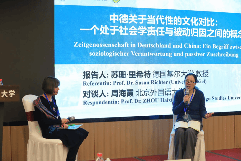 德国基尔大学苏珊·里希特(Susan Richter)教授的报告题为《中德关于同时代性的文化对比:一个处于社会学责任与被动归因之间的概念》。她从跨文化与社会学的独特视角切入,追溯“同时代性”(Zeitgenossenschaft)与“同时代人”(Zeitgenossen)在德国人文科学、文化创作与日常话语中的使用脉络,通过比较伏尔泰、腓特烈二世与乾隆等历史人物的案例,反思“同时代性”这一概念在中德不同文化语境下的内涵差异与价值归因。北外德语学院教授周海霞作为对谈人指出,中国语境中也常提及“同时代人”概念,未来可进行中德“同时代性”整合研究。双方还就“同时代”的时间界定、跨文化可比性及社交媒体时代的概念延展等议题进行了富有启发性的探讨。