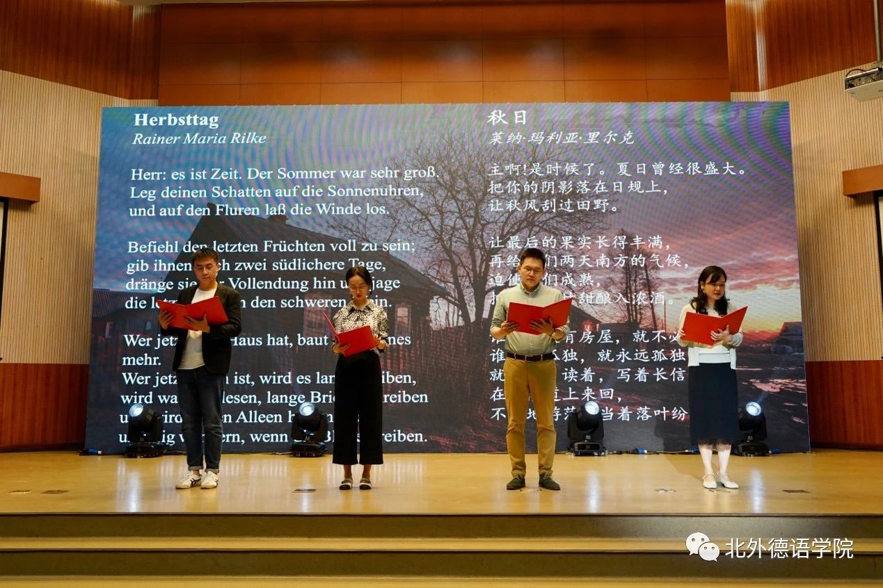 德语学院党总支委员、副院长张晓玲、寇蔻,青年教师武迪,22级硕士生姜浩远四人联袂表演中德文诗歌朗诵《秋日诗语》,朗诵了德国经典诗歌里尔克《秋日》、席勒《希望》和马克思经典著作《青年在选择职业时的考虑》(节选),使新生们感受到了德文之美、中文之妙,经典著作的隽永留香。