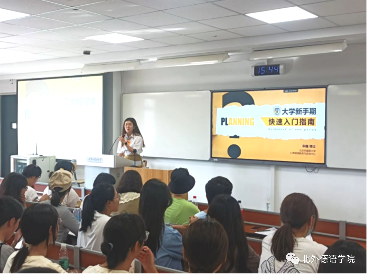 9月7日下午,在逸夫楼415教室,德语学院邀请了北京外国语大学心理健康教育与咨询中心的宋巍博士,为77位2023级本科生开展了以“大学新学期快速入门指南”为主题的本科生心理健康讲座。宋巍老师结合德语学院特色,以德国莱比锡大学为例,引出了中学与大学区别的问题,并从学习、人际、生活三个维度引入,为同学们提出了针对大学新生活适应的多种建议。与中学相比,同学们在大学生活中会面临诸如高自主性的时间管理要求、师生关系多元化、独立自主生活等不同,针对不同的具体问题,宋老师提出了不同的应对方法。